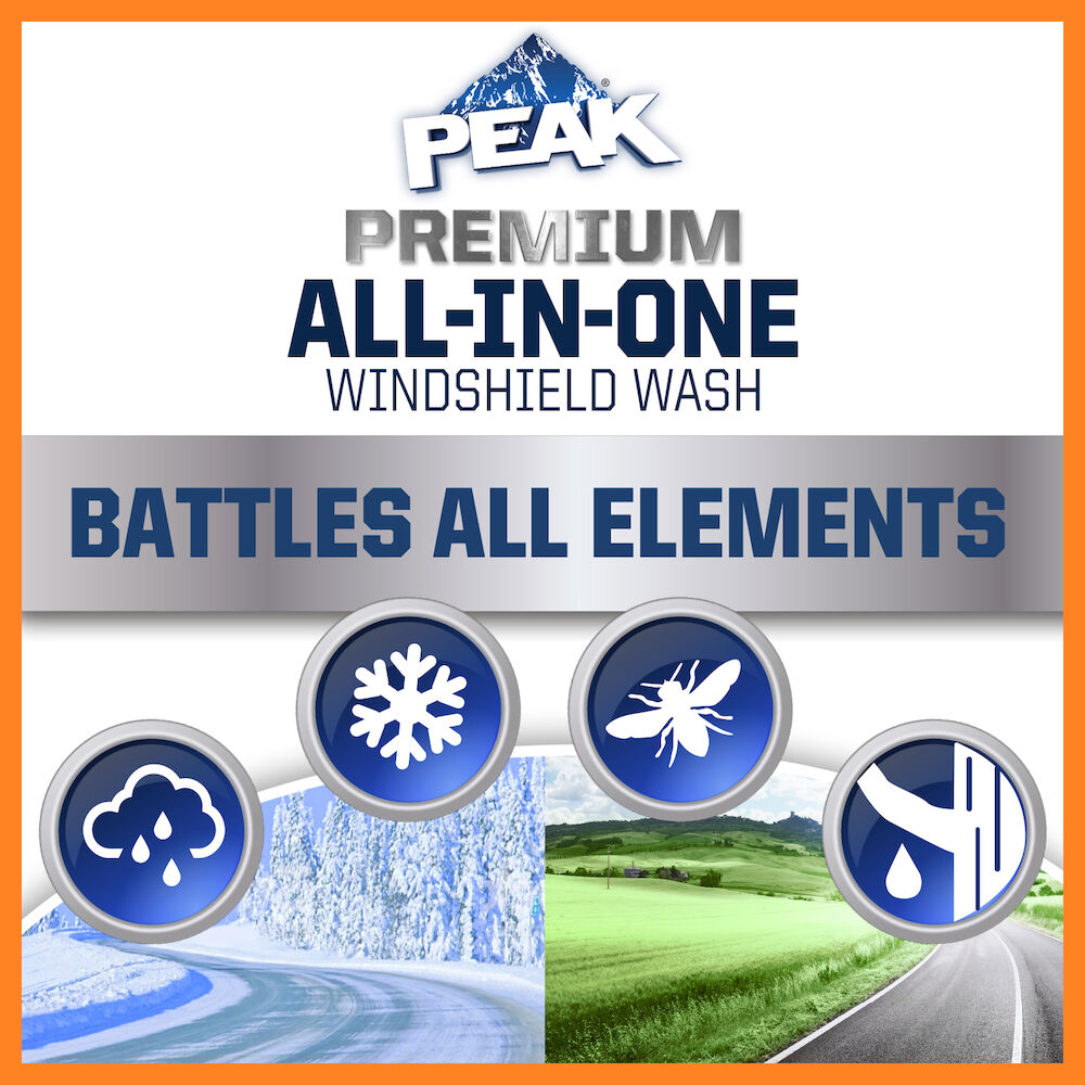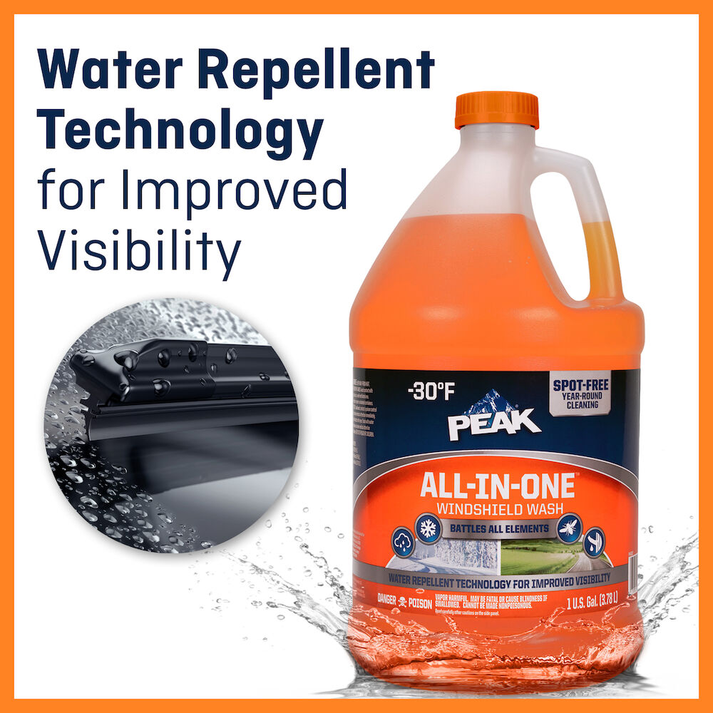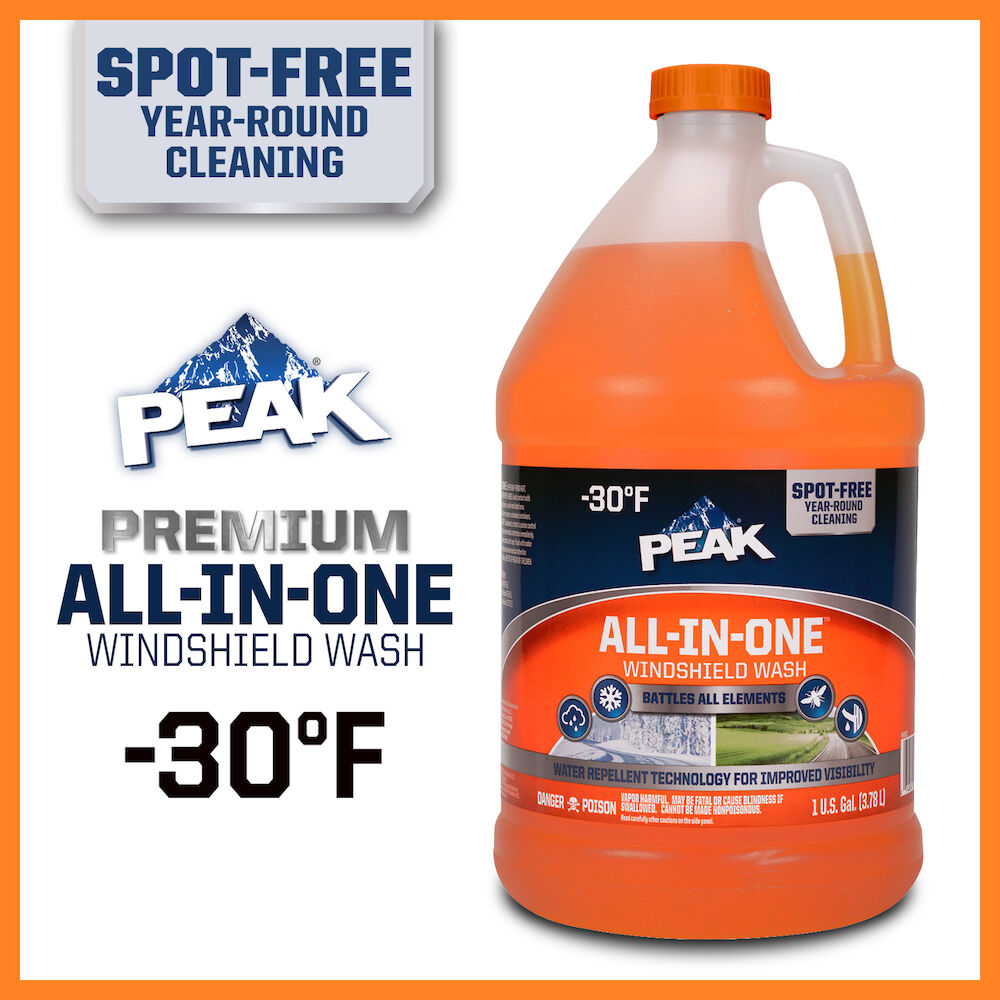 PEAK® ALL-IN-ONE™ WINDSHIELD WASH is a new premium performance formula that provides spot-free year-round cleaning with the addition of water repellent technology for improved visibility.