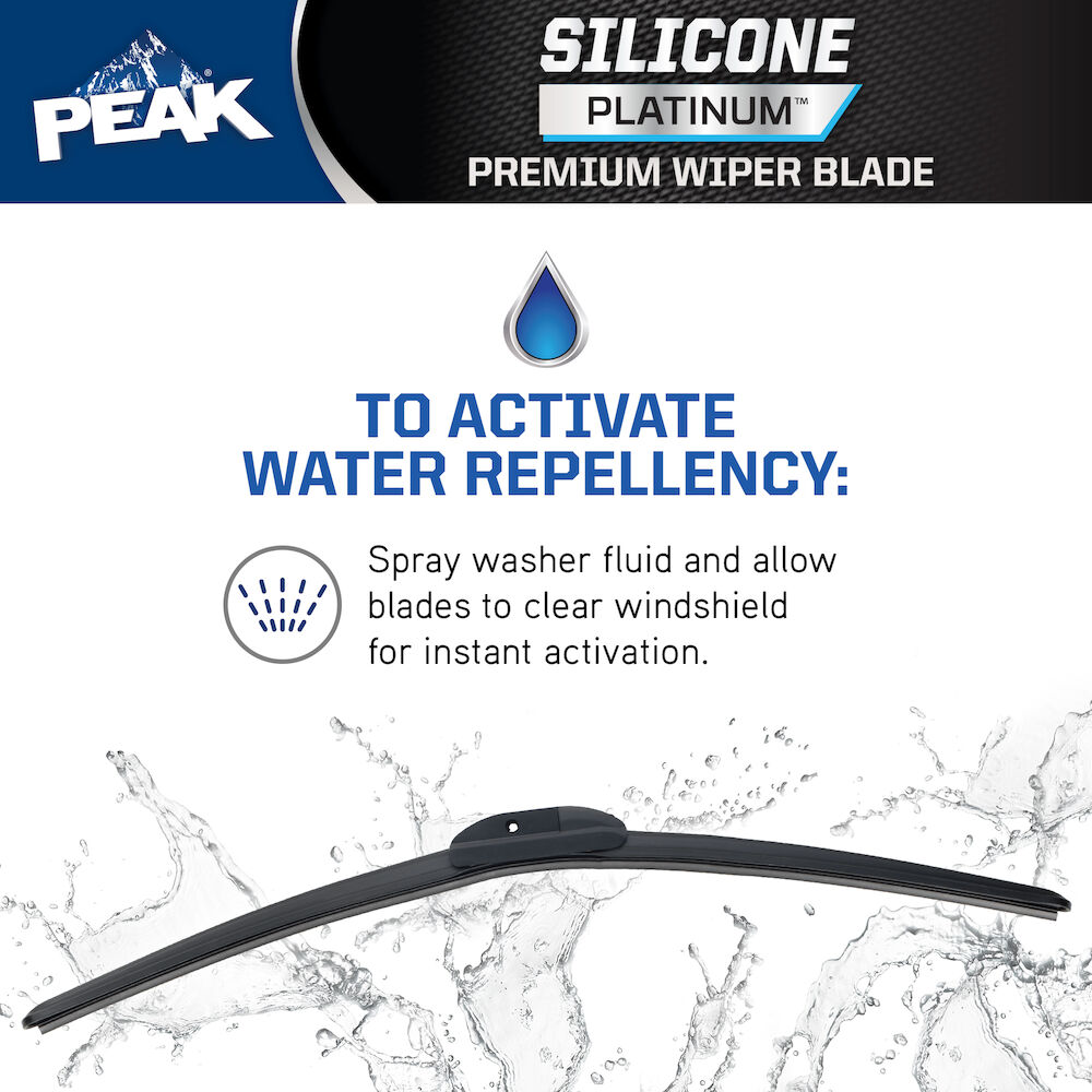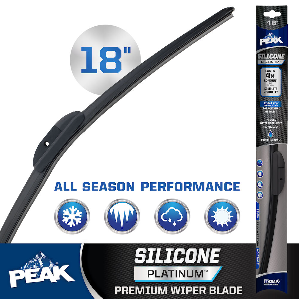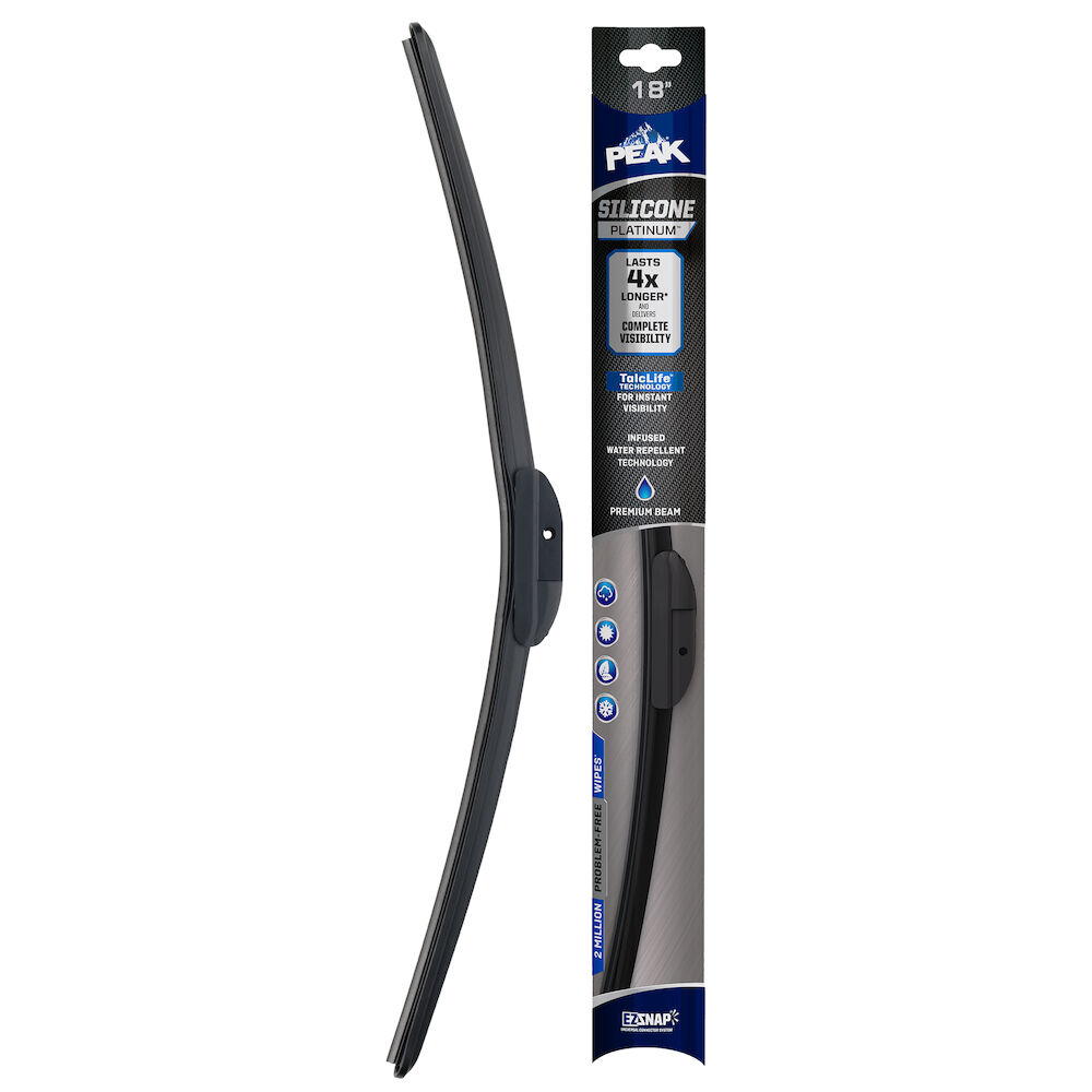 PEAK® SILICONE PLATINUM™ is our premium top-of-the-line beam wiper blade, engineered to last 4X longer and delivers complete visibility throughout every season. The Quad-layered wiping element technology is constructed with a silicone compound for longevity, providing 2 million problem-free wipers* during the life of the blade. The infused water repellent technology coats the windshield, shedding rain and winter road spray. Use of TalcLife™ Technology, a proprietary talcum coating, ensures the smoothest possible wipe. Upgrade to a high-end wiper blade that endures through all season with PEAK® SILICONE PLATINUM™ wiper blades. These blades are equipped with EZ-SNAP® Universal Connector System to fit most wiper arm styles. Installation is quick and easy with simple to follow instructions inside the package. Blades area available in lengths of 13" to 28".