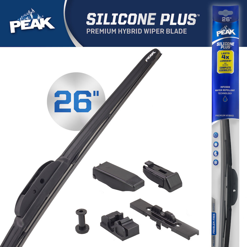 PEAK® SILICONE PLUS™ premium hybrid wiper blades are engineered to last 4X longer* and deliver complete visibility in any weather driving condition. The Tri-layer wiping element is constructed with a silicone compound for longevity providing 2 million problem-free wipes* during the life of the blade. The infused water repellent technology coats the windshield shedding rain and winter road spray. Upgrade to a premium solution to get consistent performance in all seasons with the PEAK® SILICONE PLUS™ wiper blades. These blades are equipped with EZ-SNAP® Universal Connector System to fit most wiper arm styles. Installation is quick and easy with simple to follow instructions inside the package. Blades are available in lengths of 13” to 28”.
