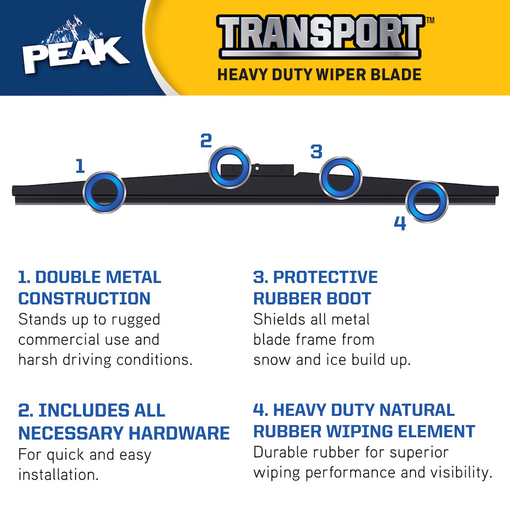 Keep your windshield clear even in tough driving conditions with PEAK Transport heavy duty wiper blades! PEAK Transport's heavy duty line fits heavy duty trucks, Class A RV’s, and school and transit buses. The durable, all metal construction stands up to rugged commercial use and harsh driving conditions, while heavy duty natural rubber helps keep visibility clearer for better safety conditions. This versatile windshield wiper blade includes all necessary hardware for a quick & easy installation, so you can replace your wiper blades in a snap. These heavy duty windshield wipers are perfect for anyone needing a higher quality performance from their wiper blades on the road!