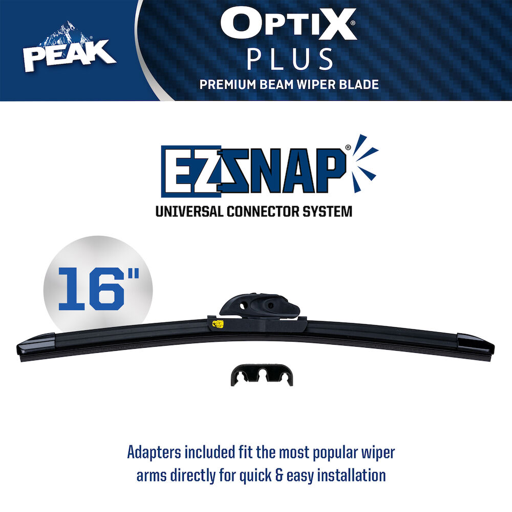 PEAK® OPTIX® PLUS premium beam wiper blades are uniquely engineered for 2X longer life* with a heavy-duty spoiler design and an enhanced dual synthetic rubber. These wiper blades are equipped with beam blade technology that evenly distributes pressure across the entire blade length, hugging even the most curved windshields to deliver a smooth, clean swipe. The advanced all-weather technology is designed to combat extreme conditions and provide year-round visibility, no matter the forecast. This blade comes with an EZCHECK Wear Indicator feature that tells you when it's the right time to replace your blades, making it a smart addition to any vehicle. PEAK® OPTIX® PLUS wiper blades are equipped with an EZ-SNAP® Universal Connector System which fits most wiper blade arms, and installation is quick with easy-to-follow instructions inside the package. Blades are available in lengths ranging from 16” to 28”.