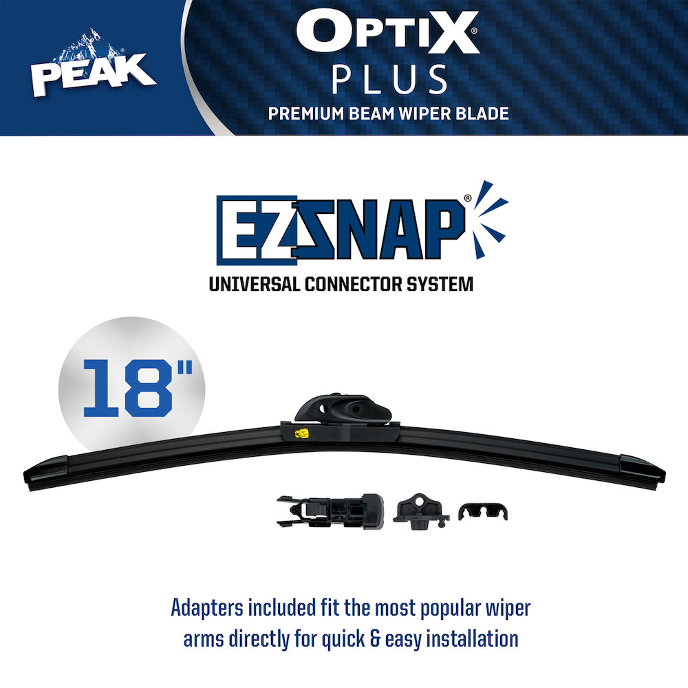 PEAK® OPTIX® PLUS premium beam wiper blades are uniquely engineered for 2X longer life* with a heavy-duty spoiler design and an enhanced dual synthetic rubber. These wiper blades are equipped with beam blade technology that evenly distributes pressure across the entire blade length, hugging even the most curved windshields to deliver a smooth, clean swipe. The advanced all-weather technology is designed to combat extreme conditions and provide year-round visibility, no matter the forecast. This blade comes with an EZCHECK Wear Indicator feature that tells you when it's the right time to replace your blades, making it a smart addition to any vehicle. PEAK® OPTIX® PLUS wiper blades are equipped with an EZ-SNAP® Universal Connector System which fits most wiper blade arms, and installation is quick with easy-to-follow instructions inside the package. Blades are available in lengths ranging from 16” to 28”.