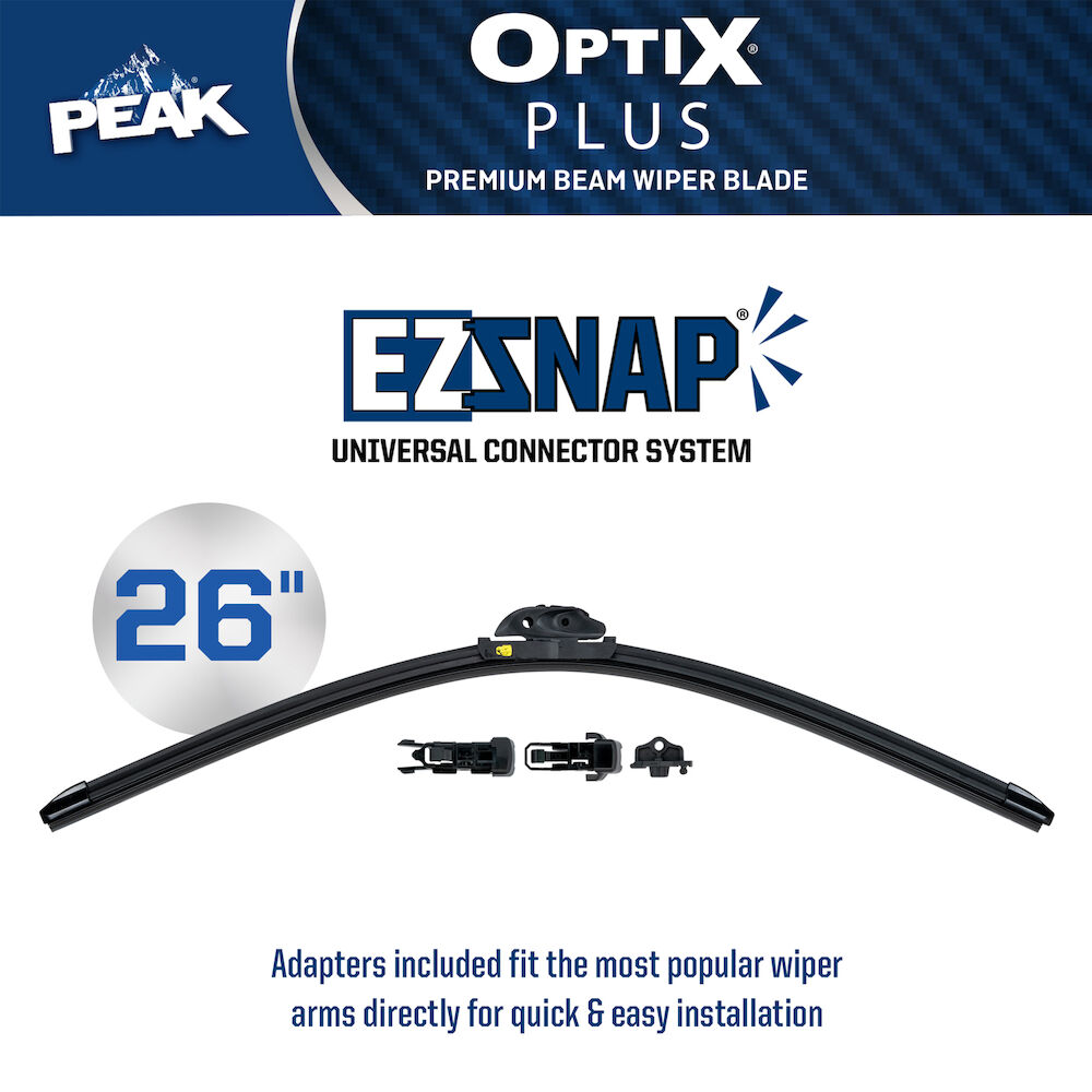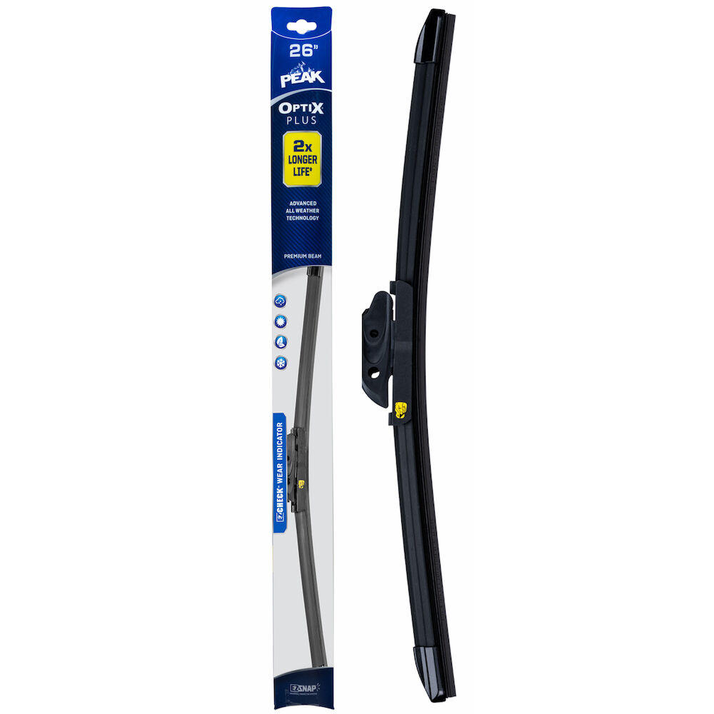 PEAK® OPTIX® PLUS premium beam wiper blades are uniquely engineered for 2X longer life* with a heavy-duty spoiler design and an enhanced dual synthetic rubber. These wiper blades are equipped with beam blade technology that evenly distributes pressure across the entire blade length, hugging even the most curved windshields to deliver a smooth, clean swipe. The advanced all-weather technology is designed to combat extreme conditions and provide year-round visibility, no matter the forecast. This blade comes with an EZCHECK Wear Indicator feature that tells you when it's the right time to replace your blades, making it a smart addition to any vehicle. PEAK® OPTIX® PLUS wiper blades are equipped with an EZ-SNAP® Universal Connector System which fits most wiper blade arms, and installation is quick with easy-to-follow instructions inside the package. Blades are available in lengths ranging from 16” to 28”.