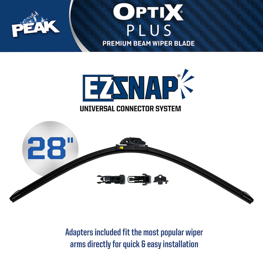 PEAK® OPTIX® PLUS premium beam wiper blades are uniquely engineered for 2X longer life* with a heavy-duty spoiler design and an enhanced dual synthetic rubber. These wiper blades are equipped with beam blade technology that evenly distributes pressure across the entire blade length, hugging even the most curved windshields to deliver a smooth, clean swipe. The advanced all-weather technology is designed to combat extreme conditions and provide year-round visibility, no matter the forecast. This blade comes with an EZCHECK Wear Indicator feature that tells you when it's the right time to replace your blades, making it a smart addition to any vehicle. PEAK® OPTIX® PLUS wiper blades are equipped with an EZ-SNAP® Universal Connector System which fits most wiper blade arms, and installation is quick with easy-to-follow instructions inside the package. Blades are available in lengths ranging from 16” to 28”.